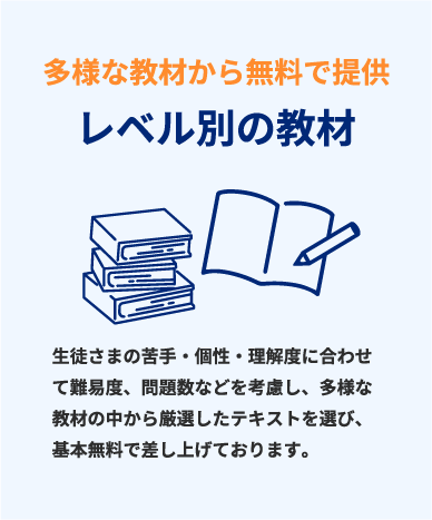 日秀塾は、どんな生徒さまにも気軽に通っていただきたいという思いから、1時間あたりの費用を安く抑え、追加費用ナシで、生徒さまにあった教材の提供をしております。