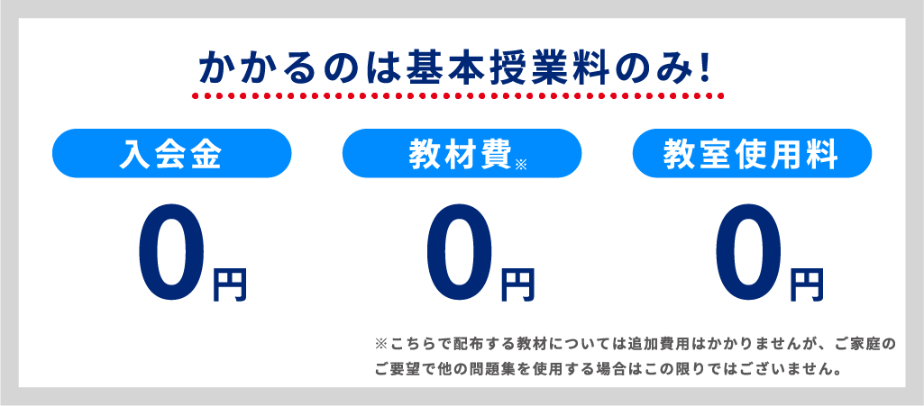入会金はいただいておりませんので、基本授業料のみでスタートできます。