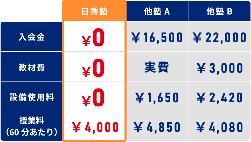 日秀塾は、どんな生徒さまにも気軽に通っていただきたいという思いから、1時間あたりの費用を安く抑え、追加費用ナシで、生徒さまにあった教材の提供をしております。